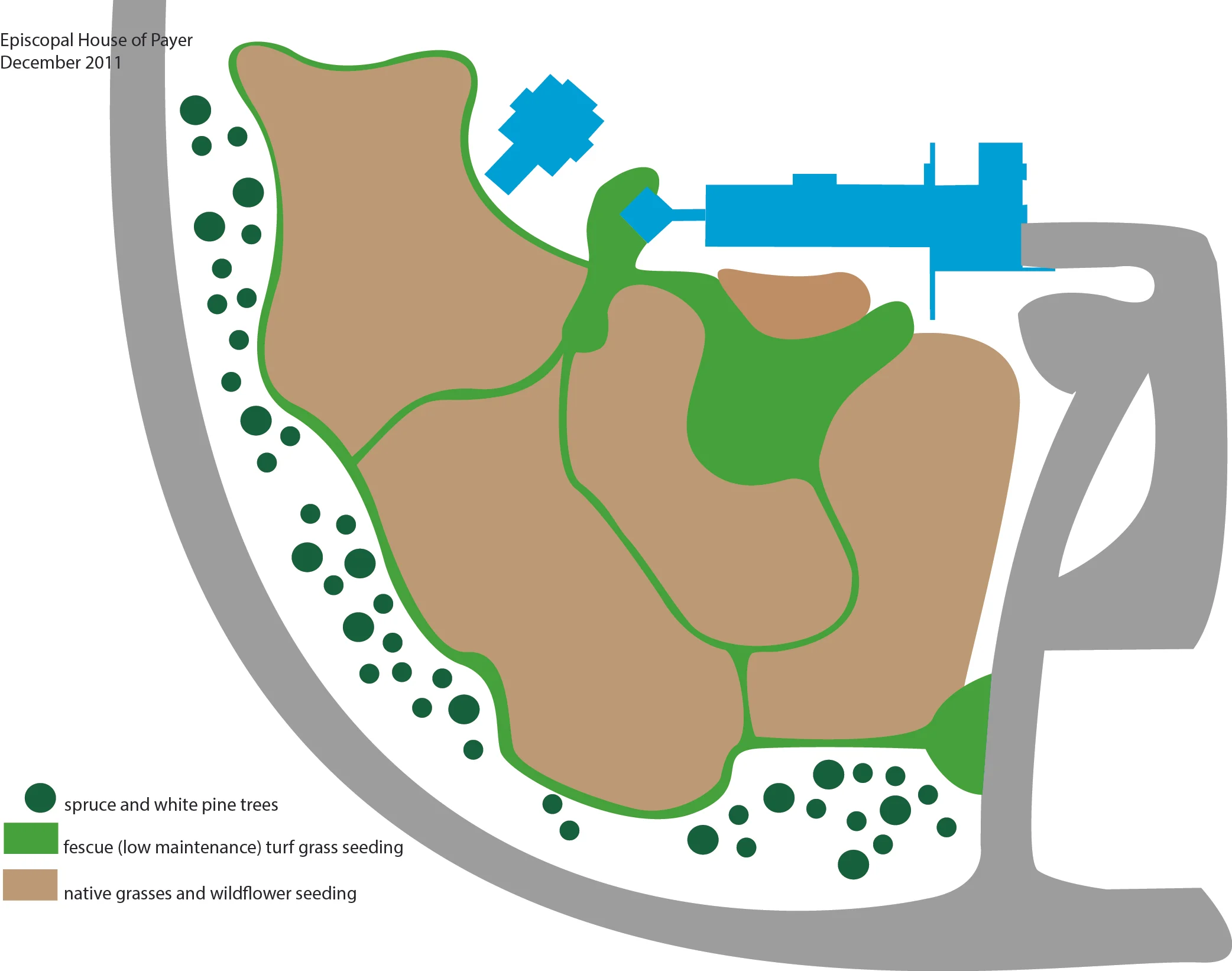 This design was for the Episcopal House of Prayer on the edge of the Saint John's Abbey property. The green represents areas that we seeded in fescue--a low maintenance turf grass--that made up the paths and several open spaces, and the brown represents areas that we seeded in native grasses and wildflowers. Illustration by Steve Heymans.