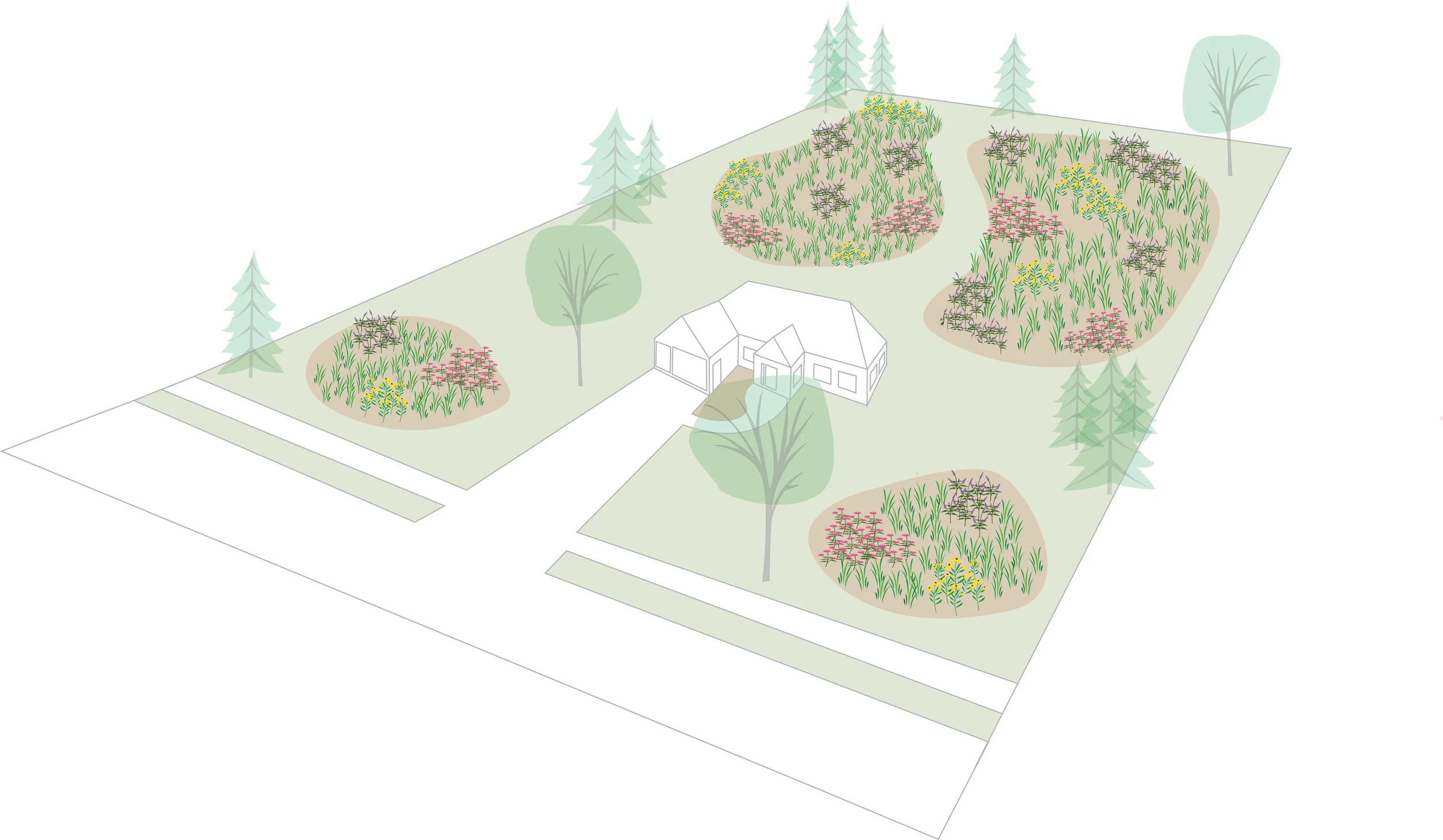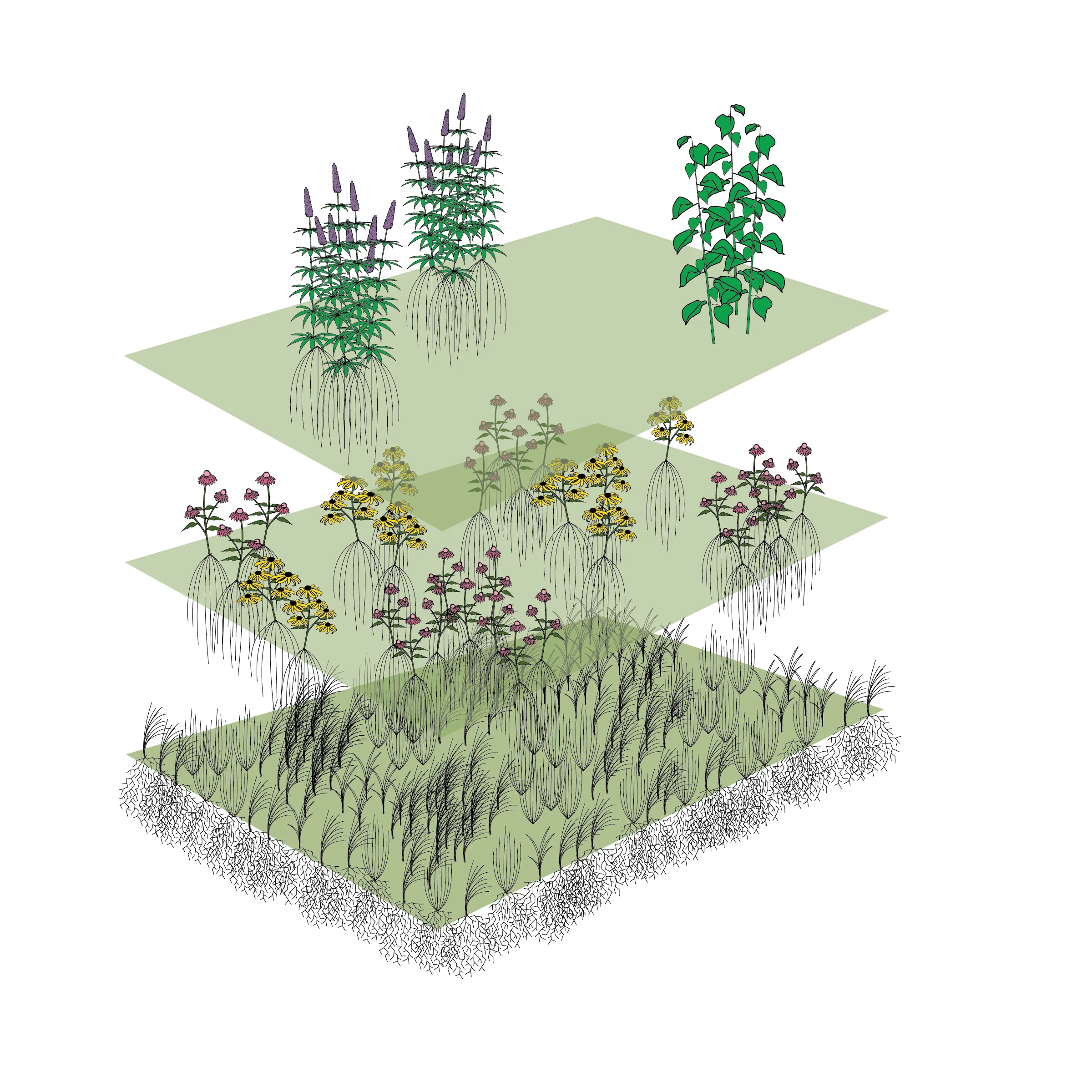 Our three-layered approach involves native grass seed on the bottom layer, wildflower plugs on the second, and more structural plants (often potted) on the third, or top, layer. Illustration by Steve Heymans.